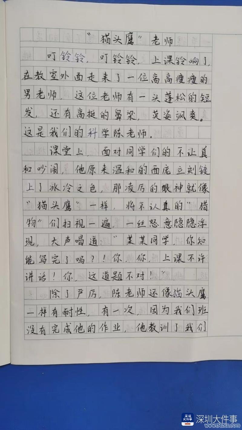 固然陈教训像猫头鹰相似特别严厉,但是他也有和煦的一面,在寰球都能崇敬听课的时候,他也会变得夷易近人,何况说话幽默。举例前次的科学课上,他让咱们画光,从册本传到眼睛的阶梯图,效果有同学画反了,教训讲了好几遍之后,照旧有东谈主出错。没目的,他只可使出绝杀技:幽默搞笑玩弄法。