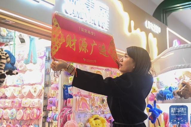 ↑2月9日开云体育,义乌海外商贸城的商户在店铺门口张贴领取的新春横幅。