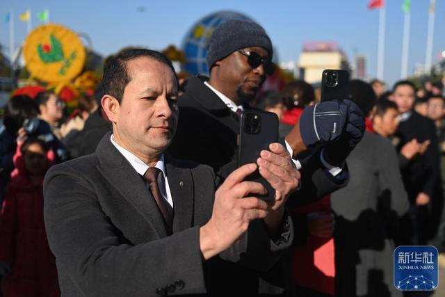 ↑2月9日,来自尼泊尔的客商(左)在义乌海外商贸城不雅看开市庆典的舞龙饰演。