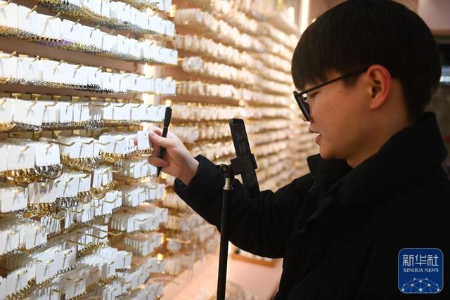 ↑2月9日,义乌海外商贸城的一家饰品店铺使命主说念主员通过手机直播平台销售产物。